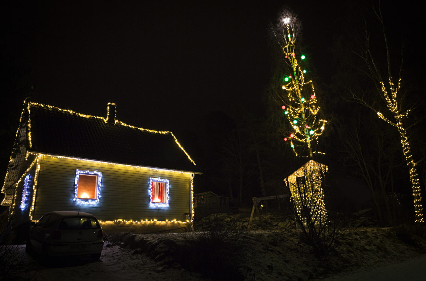 Pihakoivun latvassa tuikkii tähti ja oksia koristavat punaiset ja vihreät valopallot. Leikkimökki on verhoiltu valoverkkoon. Porvoon Tarkkisissa on talo, jonka valot tuovat iloa niin omalle väelle kuin ohikulkijoillekin.