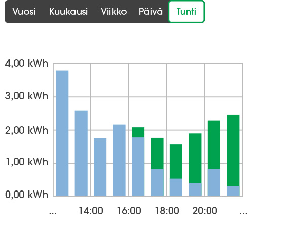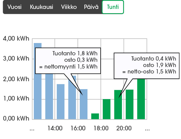 Jos ostat mittausjakson aikana 4 kWh energiaa ja tuotat 2 kWh energiaa, netotettu ostosi, jonka sähköyhtiö laskuttaa, on 2 kWh. Tuottamasi 2 kWh siis alentaa ostetuksi rekisteröidyn energian määrää, jolloin säästät energiakuluissa, siirtomaksuissa ja sähköverossa.