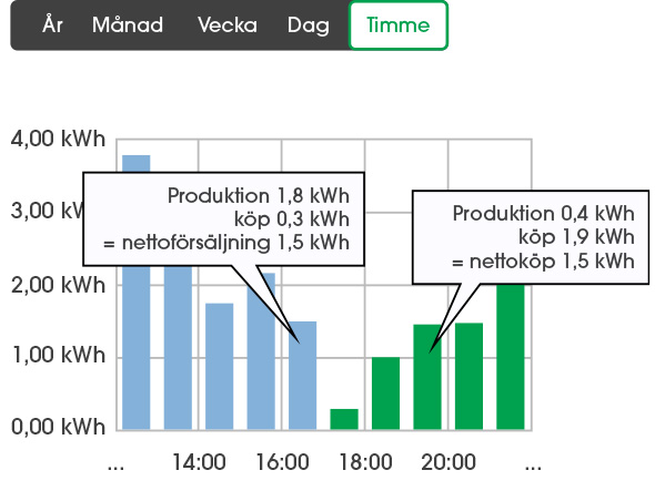 Om du under en mätperiod köper 4 kVh energi och producerar 2 kVh är ditt nettoköp, för vilket elbolaget fakturerar, 2 kWh. Den energimängd på 2 kWh, som du producerat, minskar således den som köpt energi registerade mängden, varvid du sparar i kostnaderna för energiförbrukning och elöverföring samt i elskatt.